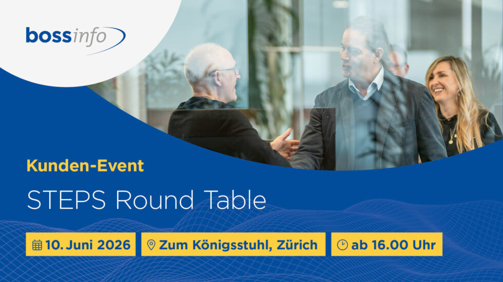 Am Mittwoch, 10. Juni 2026 begrüssen wir unsere STEPS Kundinnen und Kunden zu einem Round Table und informieren über Aktuelles aus dem Hause Boss Info und stellen die Strategie STEPS 2027 vor.